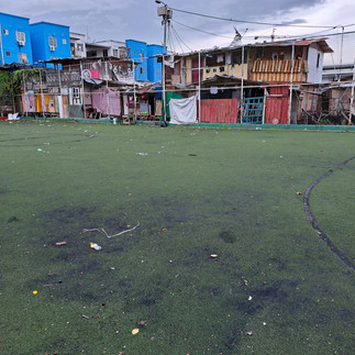 Pastor Luis' church entrance (left) / The interior of the church (center) / Adjacent playfield for neighborhood kids (right)